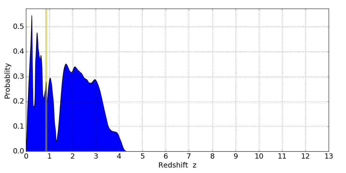 In P(z) plots: Yellow lines mark the cluster redshift z = 0.870,