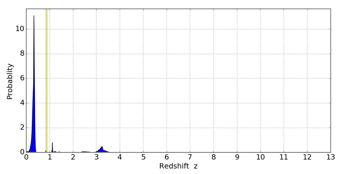 In P(z) plots: Yellow lines mark the cluster redshift z = 0.870,