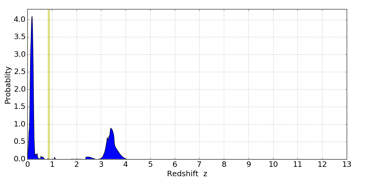 In P(z) plots: Yellow lines mark the cluster redshift z = 0.870,