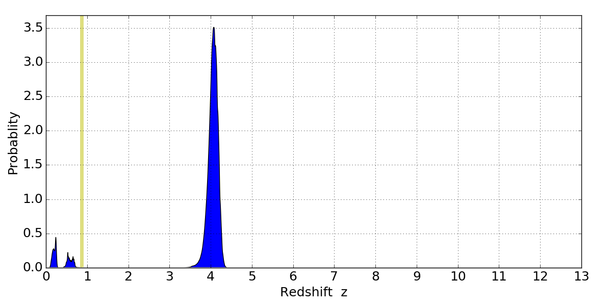 In P(z) plots: Yellow lines mark the cluster redshift z = 0.870,