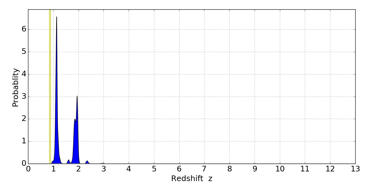In P(z) plots: Yellow lines mark the cluster redshift z = 0.870,