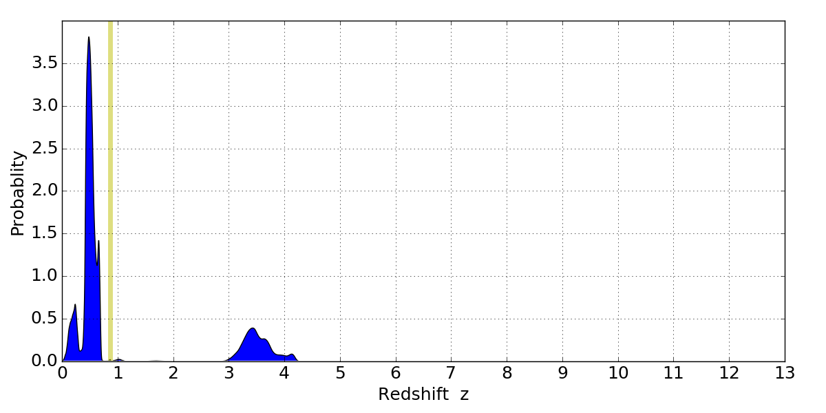 In P(z) plots: Yellow lines mark the cluster redshift z = 0.870,