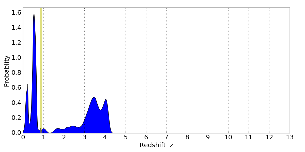 In P(z) plots: Yellow lines mark the cluster redshift z = 0.870,