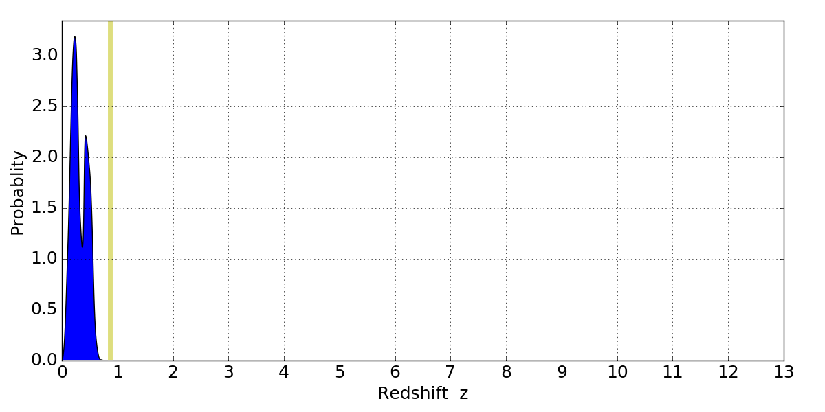 In P(z) plots: Yellow lines mark the cluster redshift z = 0.870,
