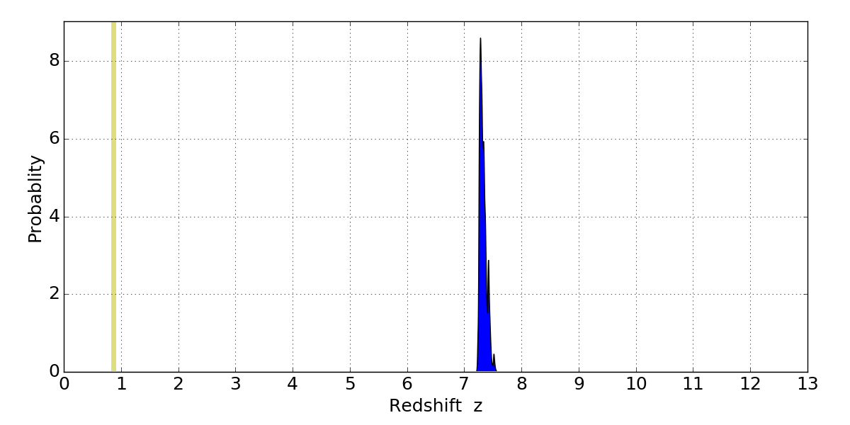 In P(z) plots: Yellow lines mark the cluster redshift z = 0.870,