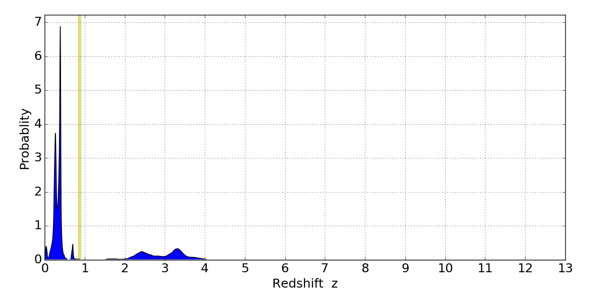 In P(z) plots: Yellow lines mark the cluster redshift z = 0.870,