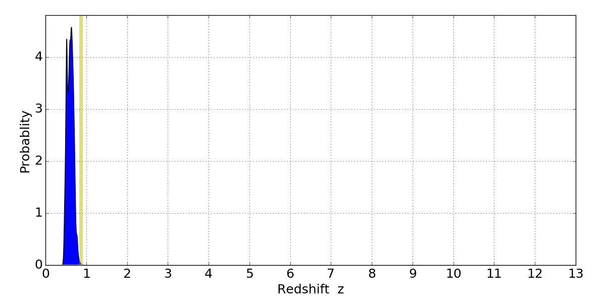 In P(z) plots: Yellow lines mark the cluster redshift z = 0.870,