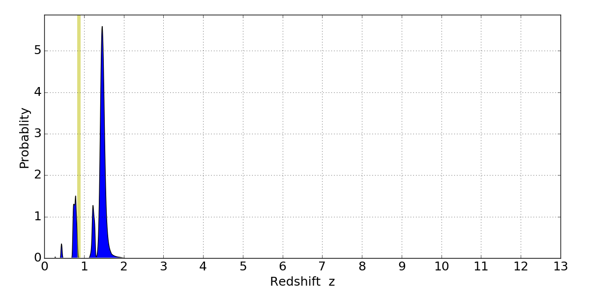 In P(z) plots: Yellow lines mark the cluster redshift z = 0.870,