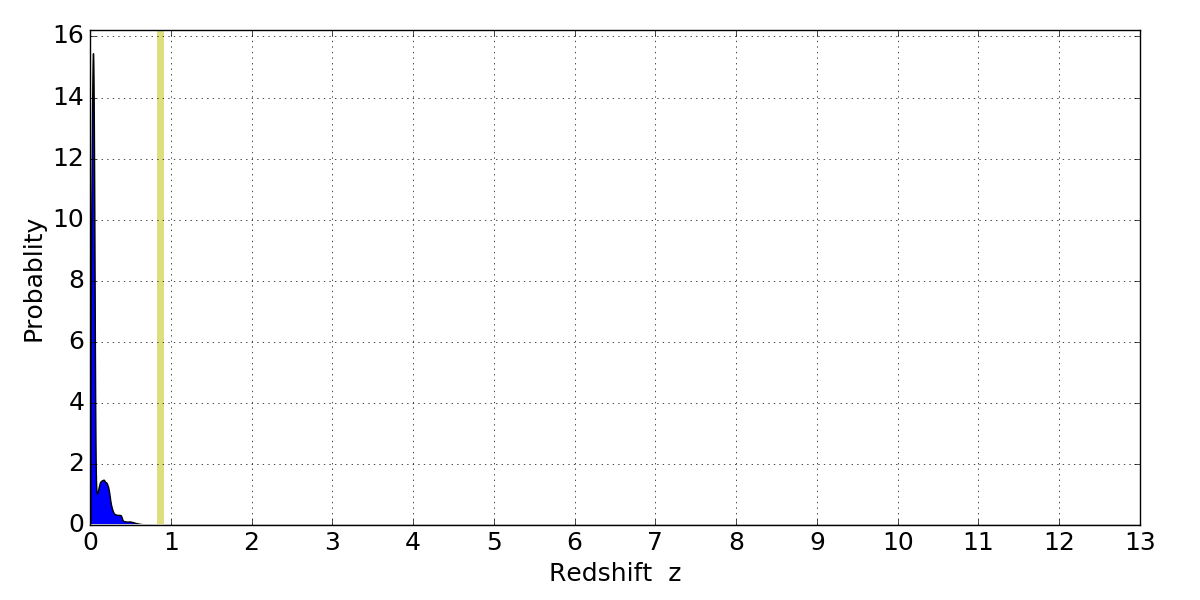In P(z) plots: Yellow lines mark the cluster redshift z = 0.870,