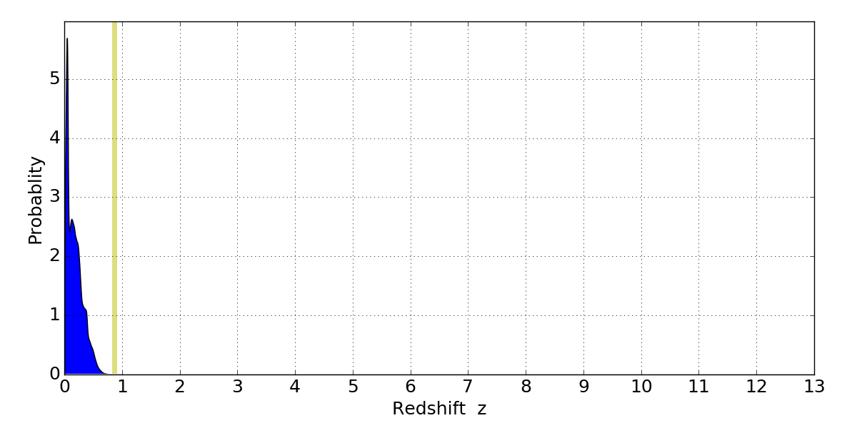 In P(z) plots: Yellow lines mark the cluster redshift z = 0.870,