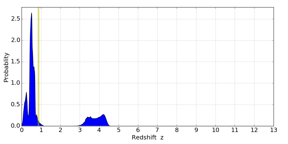 In P(z) plots: Yellow lines mark the cluster redshift z = 0.870,