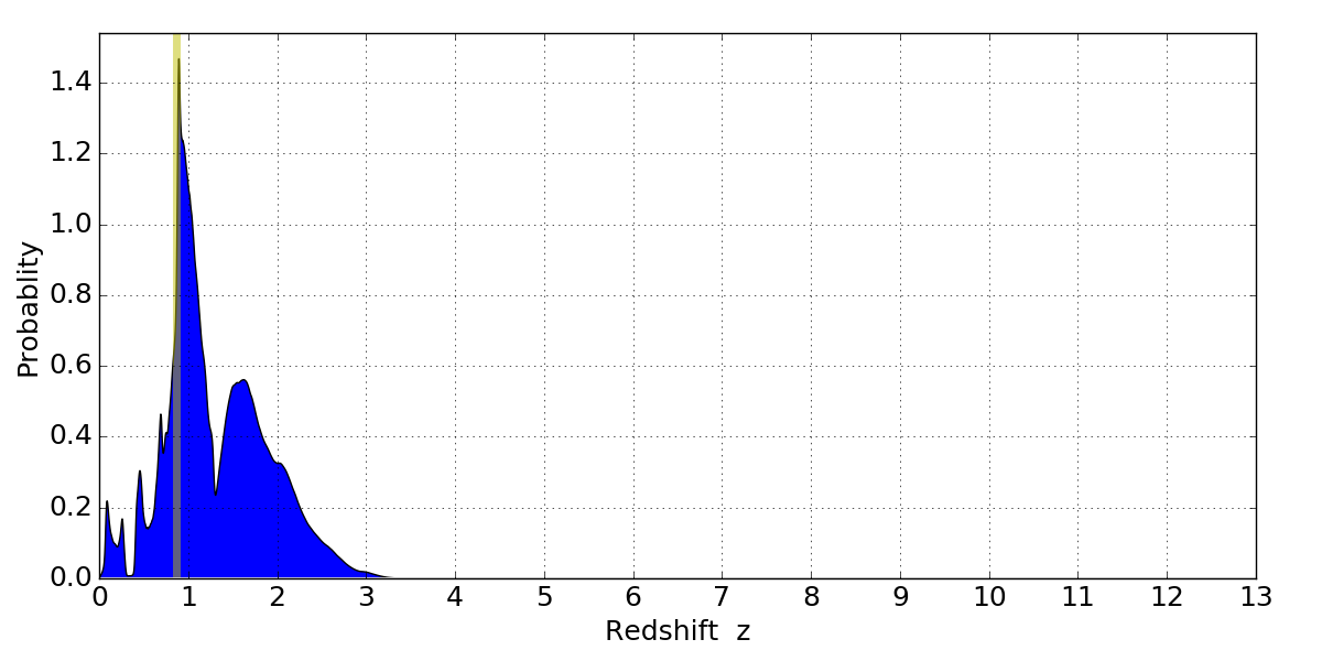 In P(z) plots: Yellow lines mark the cluster redshift z = 0.870,
