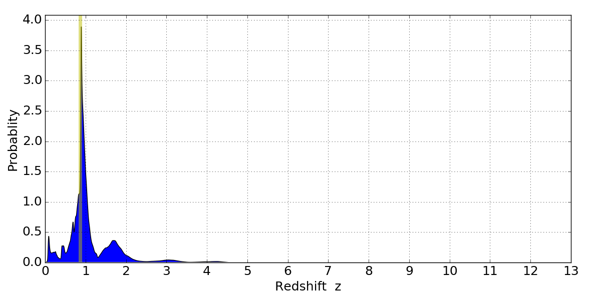 In P(z) plots: Yellow lines mark the cluster redshift z = 0.870,
