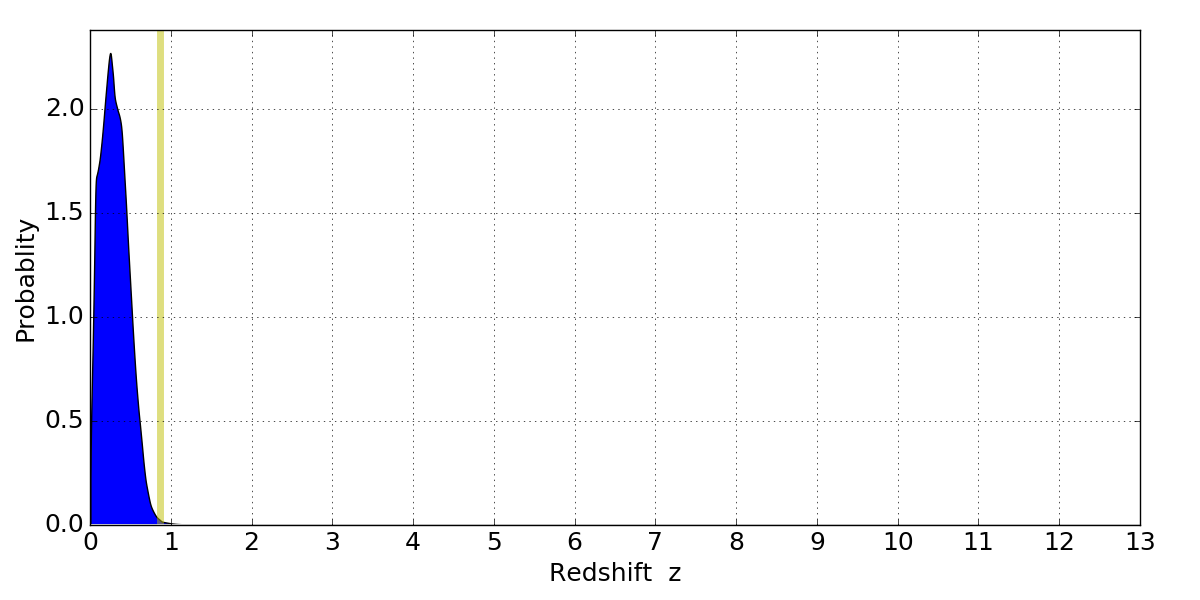 In P(z) plots: Yellow lines mark the cluster redshift z = 0.870,