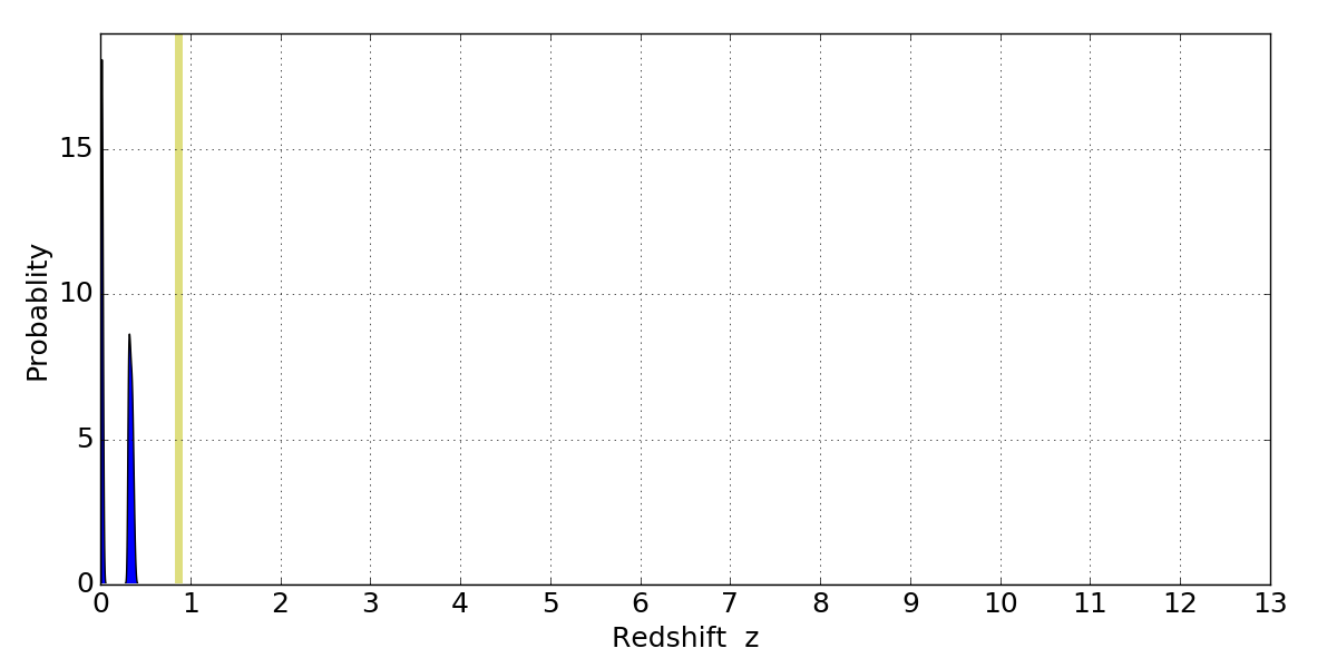 In P(z) plots: Yellow lines mark the cluster redshift z = 0.870,