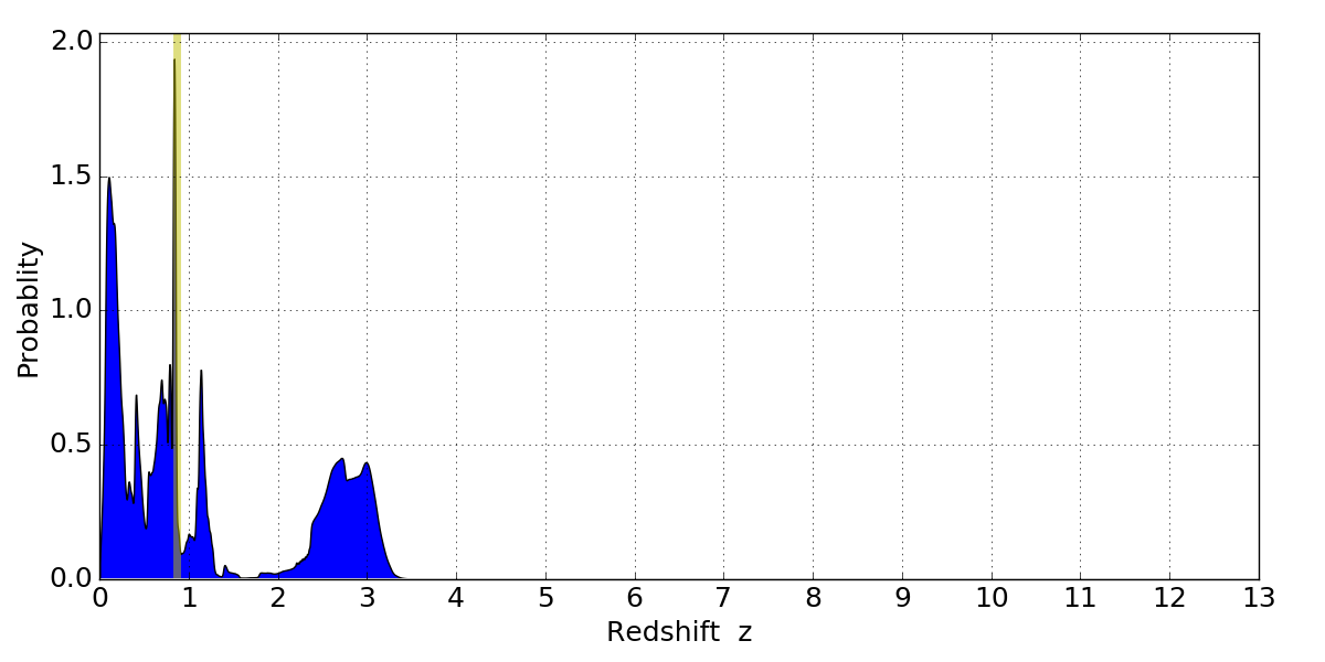 In P(z) plots: Yellow lines mark the cluster redshift z = 0.870,
