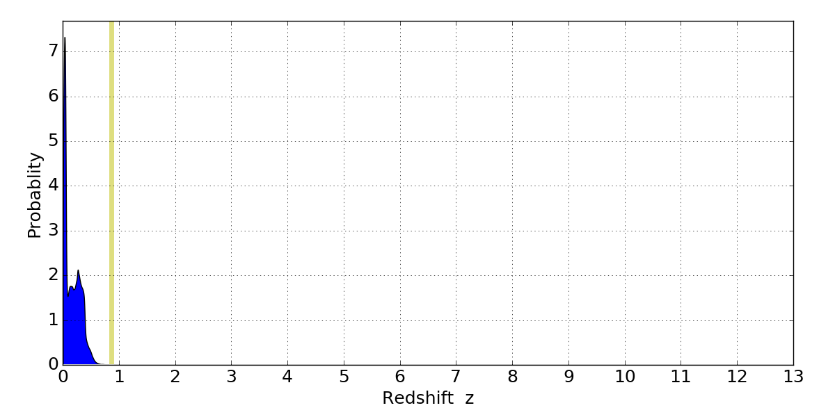 In P(z) plots: Yellow lines mark the cluster redshift z = 0.870,