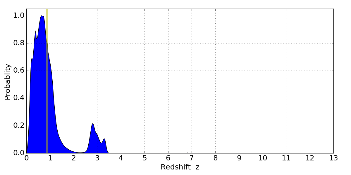 In P(z) plots: Yellow lines mark the cluster redshift z = 0.870,