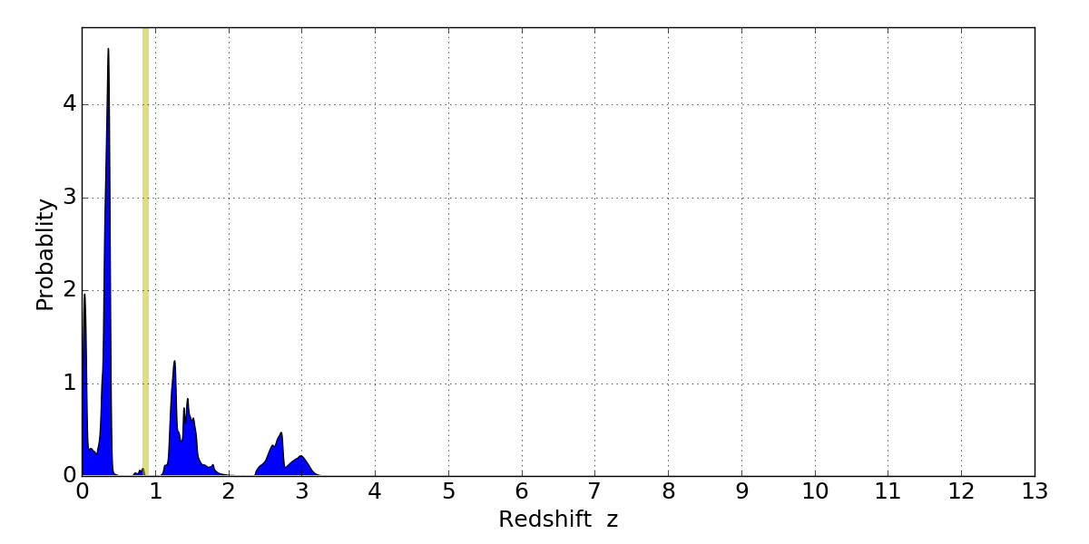 In P(z) plots: Yellow lines mark the cluster redshift z = 0.870,