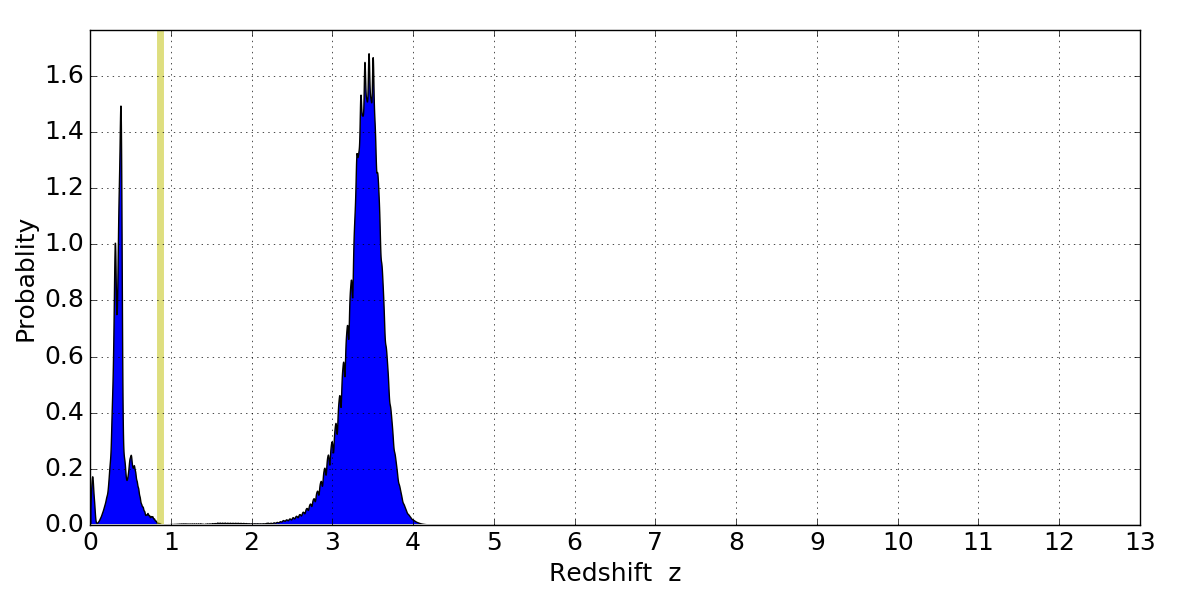 In P(z) plots: Yellow lines mark the cluster redshift z = 0.870,
