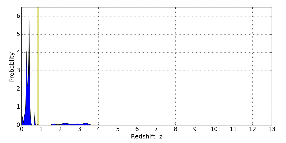 In P(z) plots: Yellow lines mark the cluster redshift z = 0.870,