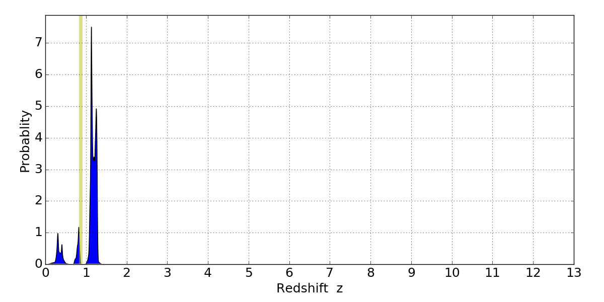 In P(z) plots: Yellow lines mark the cluster redshift z = 0.870,