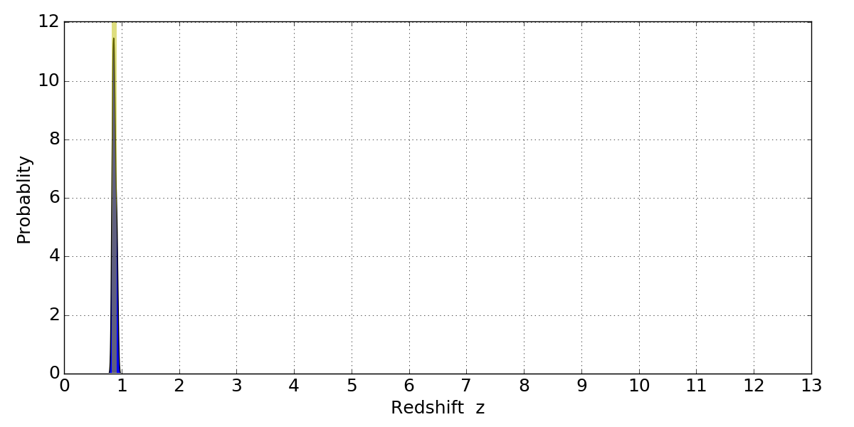 In P(z) plots: Yellow lines mark the cluster redshift z = 0.870,