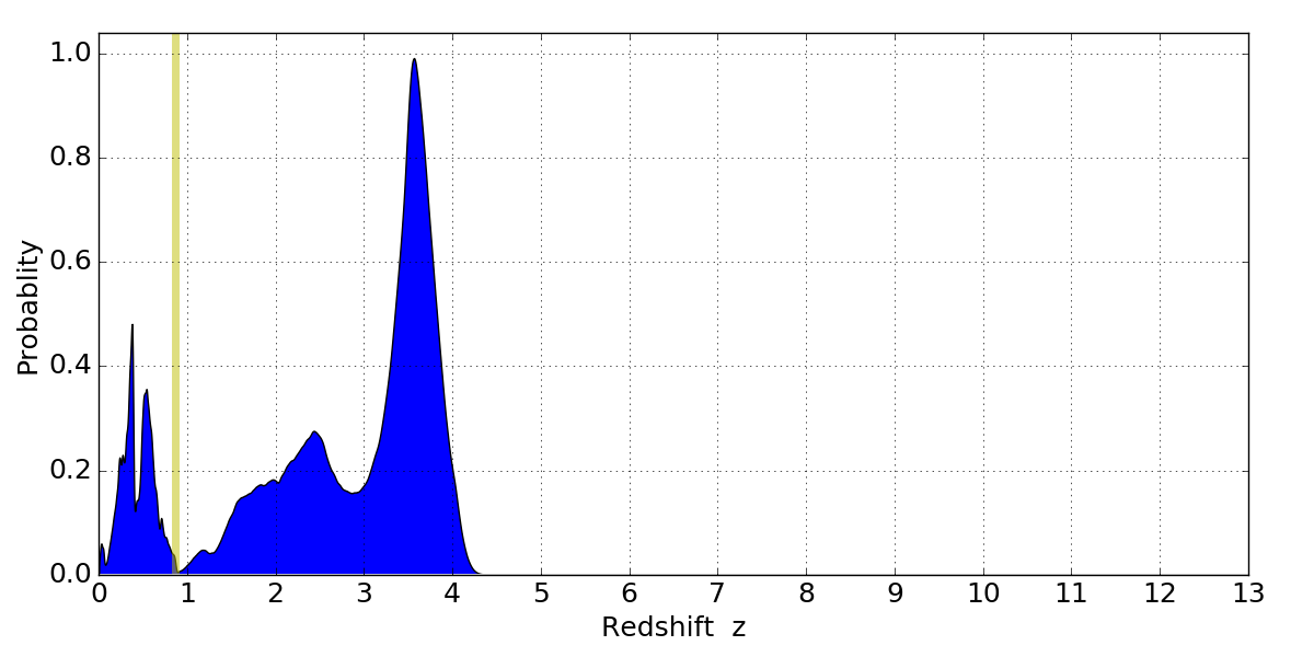 In P(z) plots: Yellow lines mark the cluster redshift z = 0.870,