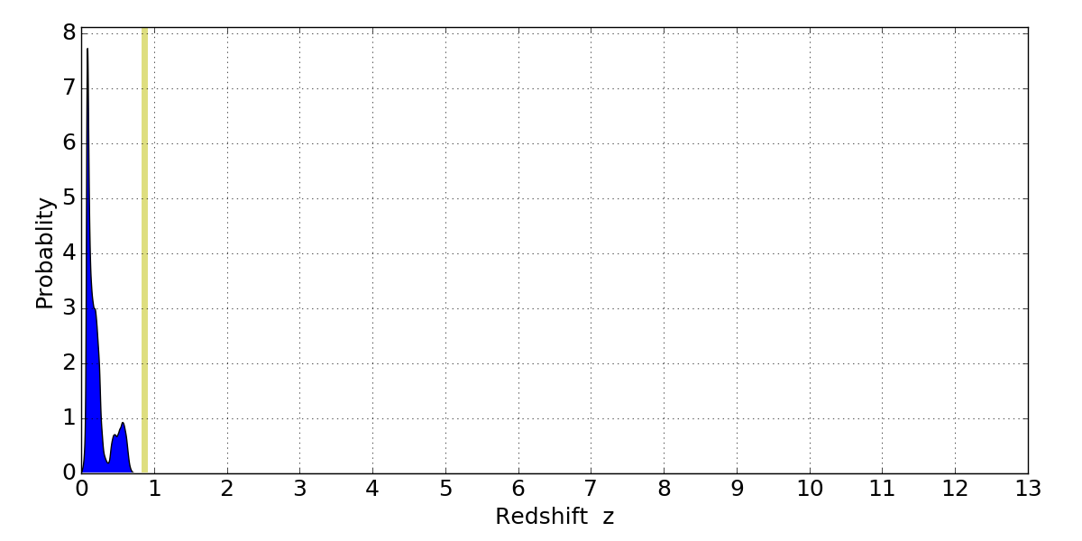 In P(z) plots: Yellow lines mark the cluster redshift z = 0.870,