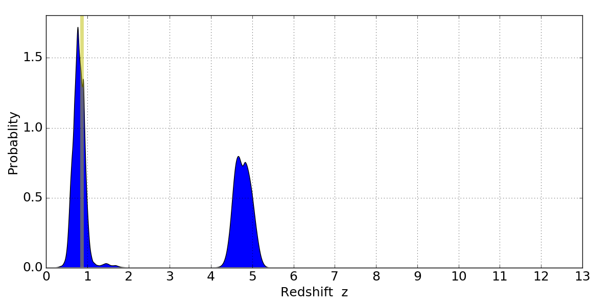 In P(z) plots: Yellow lines mark the cluster redshift z = 0.870,