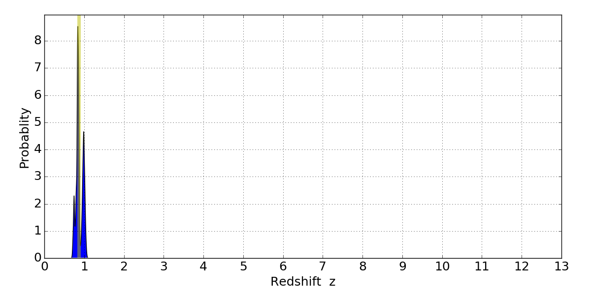 In P(z) plots: Yellow lines mark the cluster redshift z = 0.870,