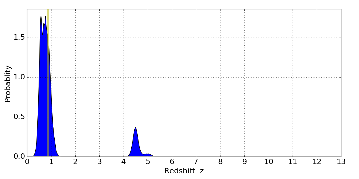 In P(z) plots: Yellow lines mark the cluster redshift z = 0.870,