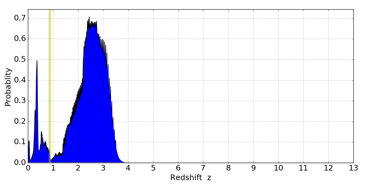 In P(z) plots: Yellow lines mark the cluster redshift z = 0.870,