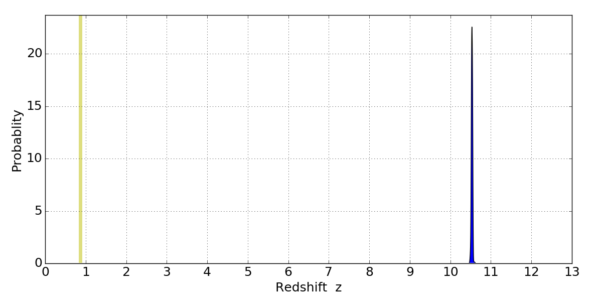 In P(z) plots: Yellow lines mark the cluster redshift z = 0.870,