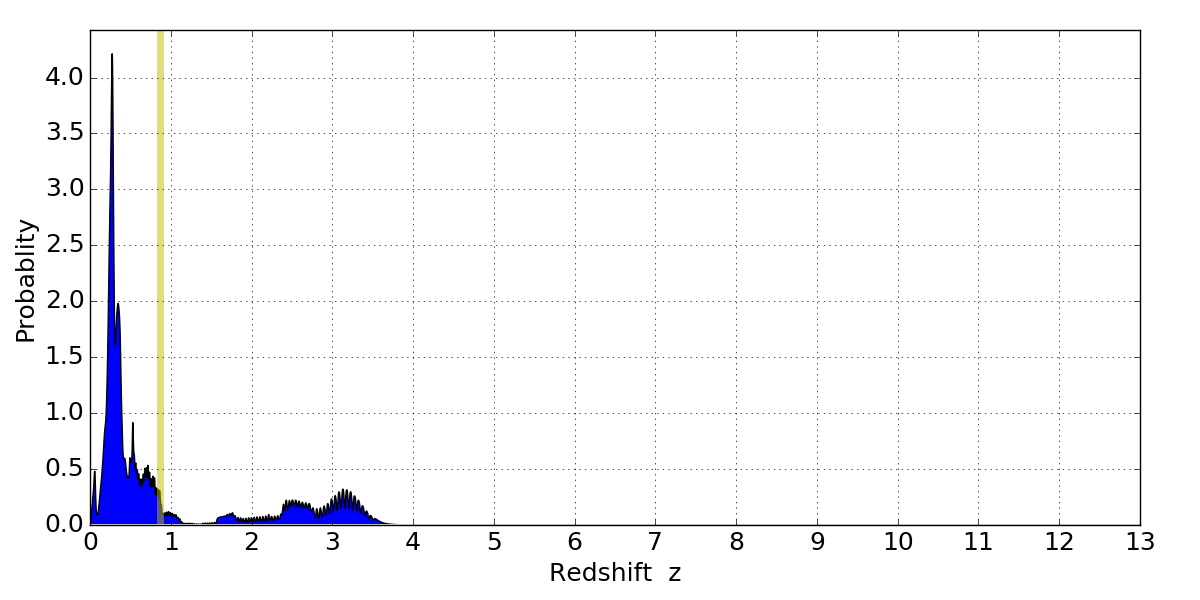 In P(z) plots: Yellow lines mark the cluster redshift z = 0.870,