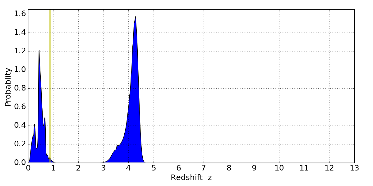 In P(z) plots: Yellow lines mark the cluster redshift z = 0.870,