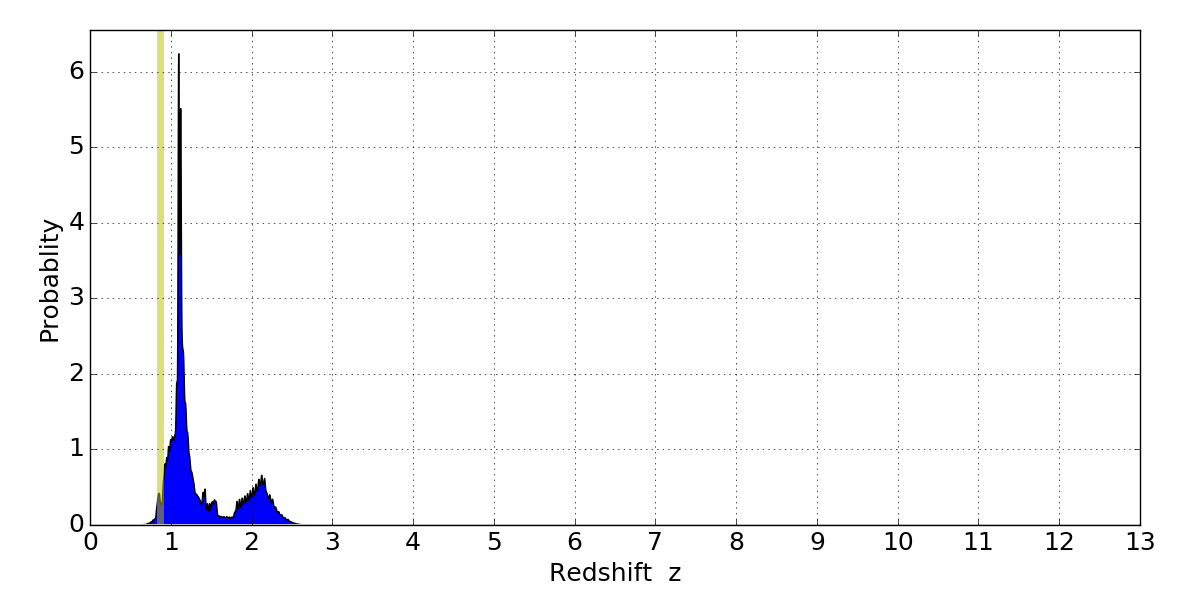 In P(z) plots: Yellow lines mark the cluster redshift z = 0.870,
