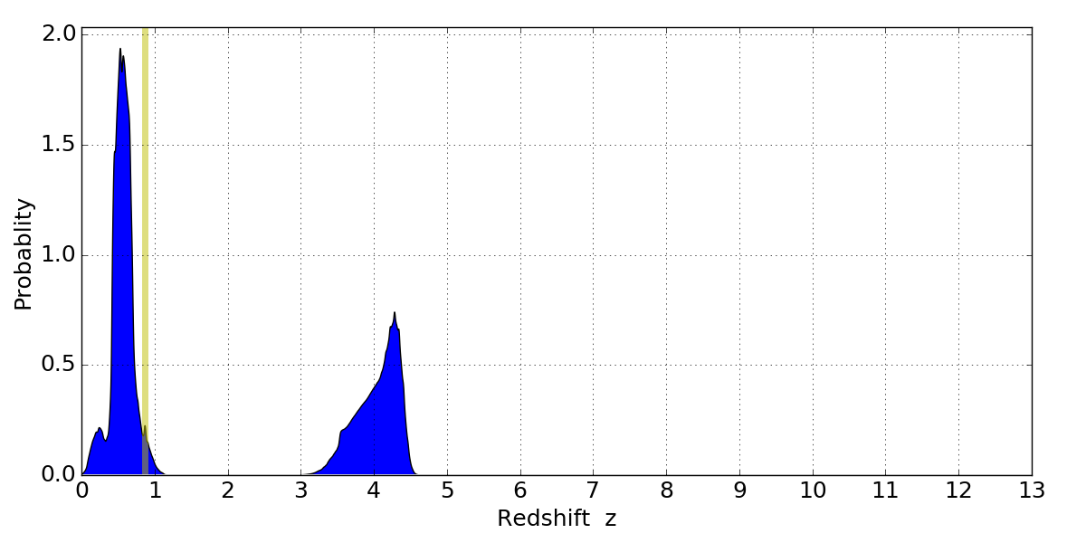 In P(z) plots: Yellow lines mark the cluster redshift z = 0.870,