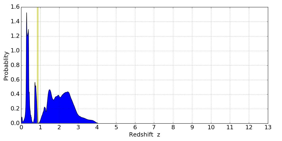 In P(z) plots: Yellow lines mark the cluster redshift z = 0.870,