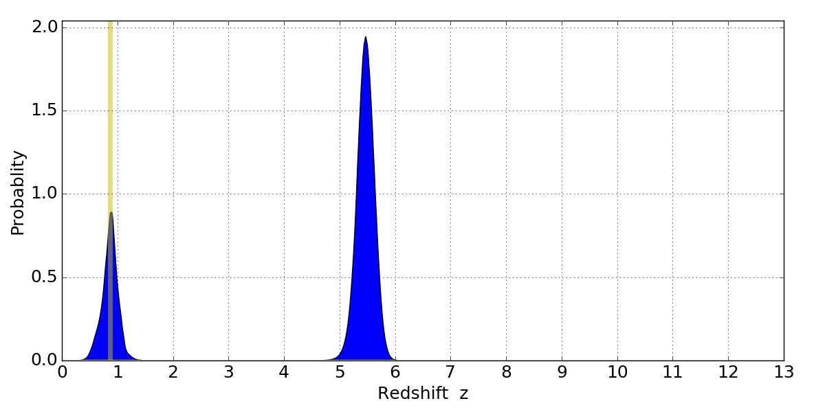 In P(z) plots: Yellow lines mark the cluster redshift z = 0.870,