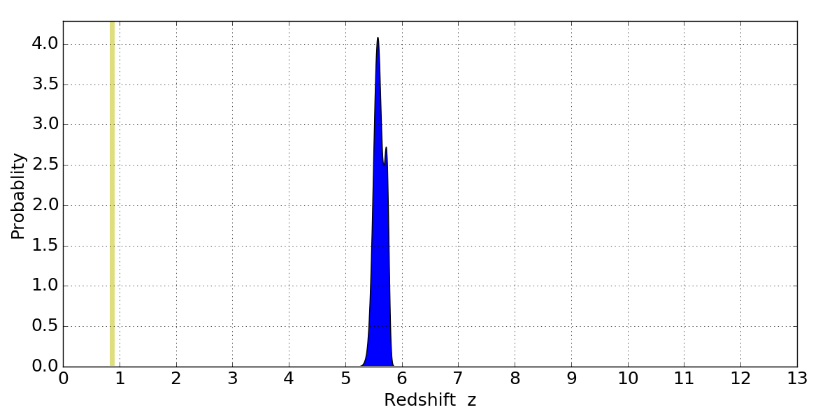 In P(z) plots: Yellow lines mark the cluster redshift z = 0.870,