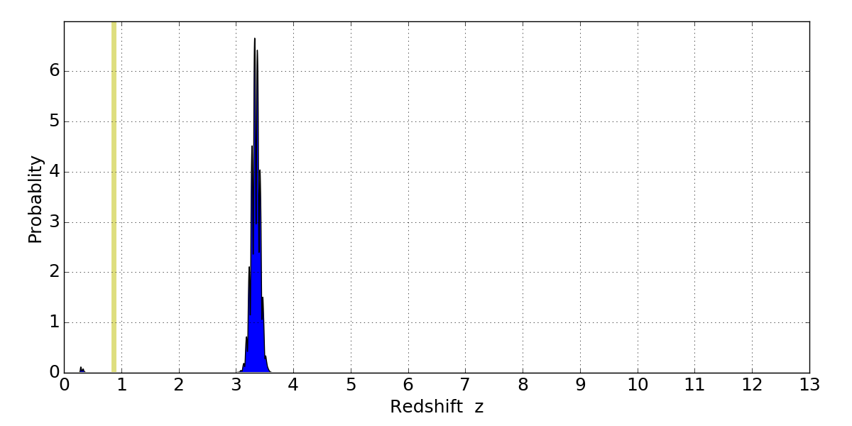 In P(z) plots: Yellow lines mark the cluster redshift z = 0.870,
