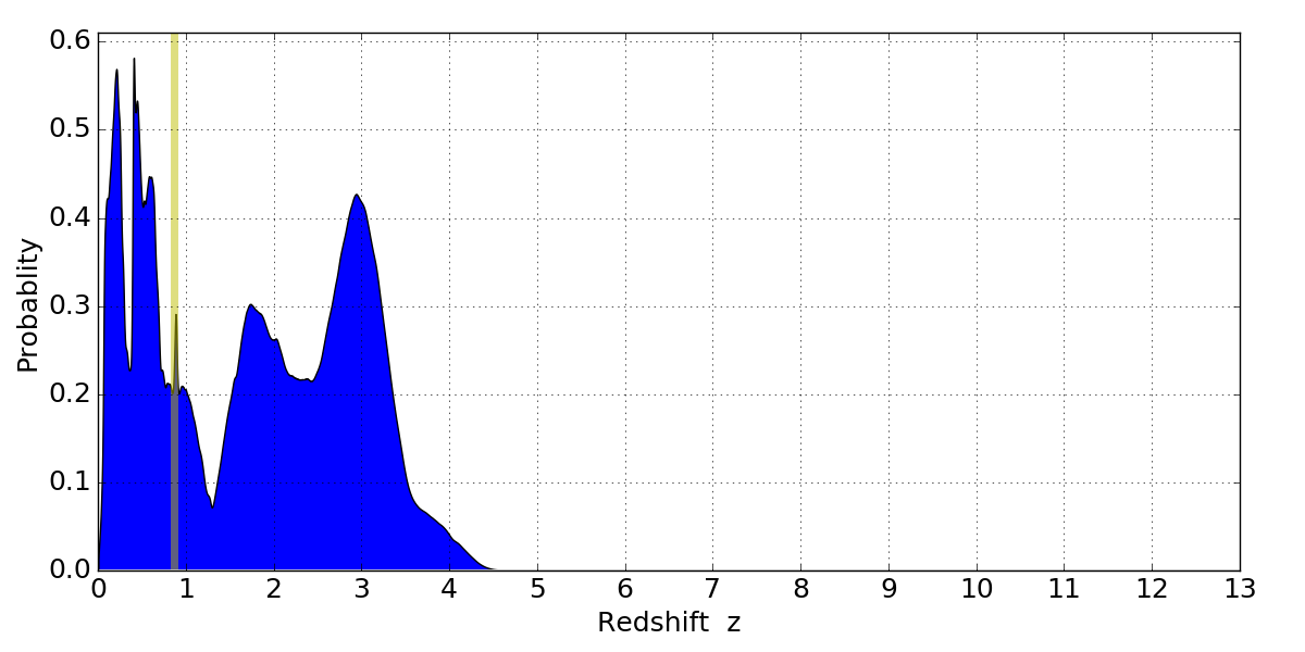In P(z) plots: Yellow lines mark the cluster redshift z = 0.870,