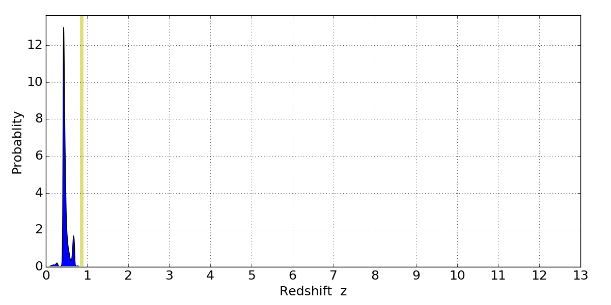 In P(z) plots: Yellow lines mark the cluster redshift z = 0.870,