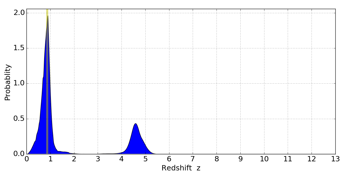 In P(z) plots: Yellow lines mark the cluster redshift z = 0.870,