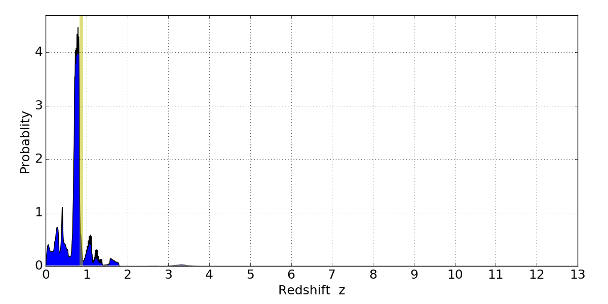 In P(z) plots: Yellow lines mark the cluster redshift z = 0.870,