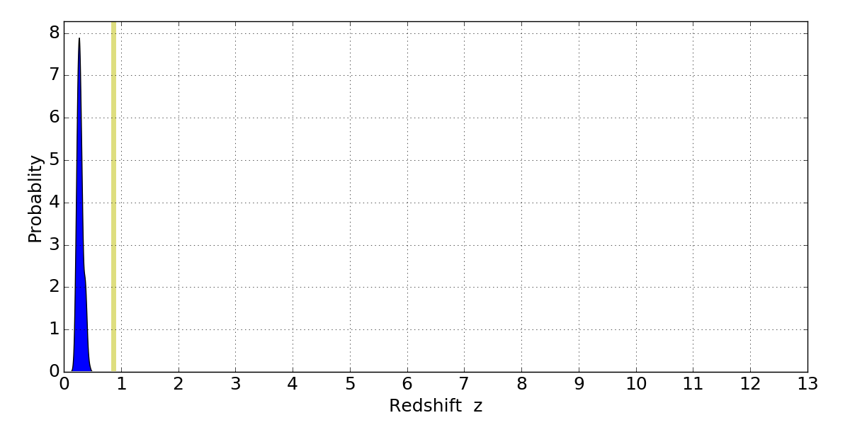 In P(z) plots: Yellow lines mark the cluster redshift z = 0.870,