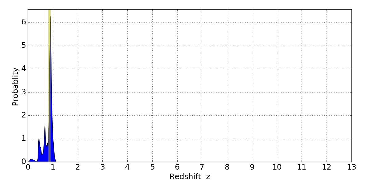 In P(z) plots: Yellow lines mark the cluster redshift z = 0.870,
