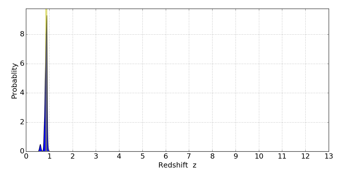 In P(z) plots: Yellow lines mark the cluster redshift z = 0.870,