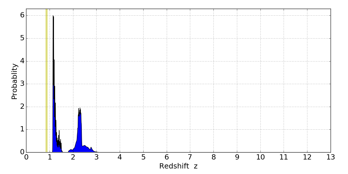In P(z) plots: Yellow lines mark the cluster redshift z = 0.870,